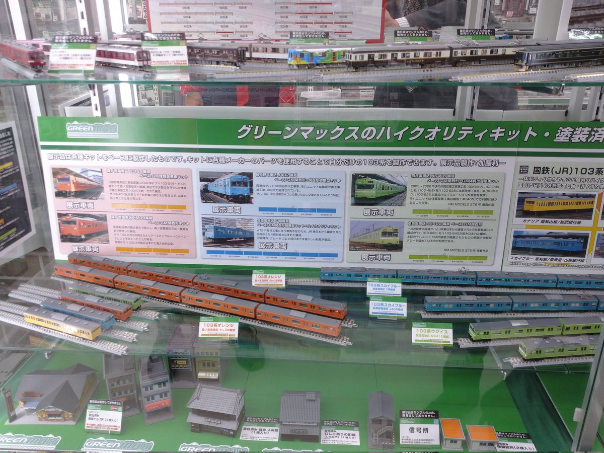 我們在大阪日本橋的スーパーキッズランド本店展示櫃中,展示了以103系已塗裝套件為基礎、由工作人員加工改造的車輛。另有大量グリーンマックス製車輛與建築物模型(ストラクチャ)樣品展示中。購物時請務必來看看!