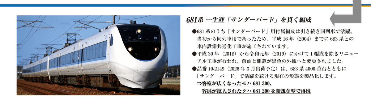 【大阪方的流線型車頭】在特急「サンダーバード(雷鳥)」上運用已達30年的681系附屬3輛編成。配合683系登場,クハ681進行了無障礙對應,モハ681則進行了客室擴大改造。自2018年起陸續有翻新車出場,至今仍有3組編成與683系0・4000番台一同活躍。